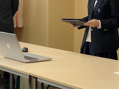 密を避けるため、校長室からGoogle Meetを使って各学年・生徒会の代表が二学期の総括を発表しました。