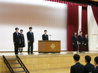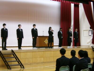 本日、6時間目には後期生徒会役員認証式がありました。前期まで生徒会を引っ張っていった3年生の生徒会役員や2年生の役員とは一旦ここでお別れとなってしまいましたが、後期からは新たに1年生が3名加わり、新体制でのスタートとなりました。